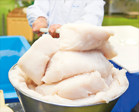 「原料のすり身にはスケソウダラを使っていますが、うちでは品質を重視し、洋上加工のものに徹底してこだわっているんです」