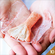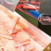 麺切りしたかまぼこの繊維を束ねてシートでくるみ、表面をほんのり赤く色づけして殺菌加熱すれば完成。ちなみに、「かに風味かまぼこ」の1本を形成するかまぼこの繊維は、およそ100本というから驚きです。
