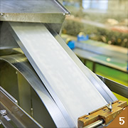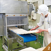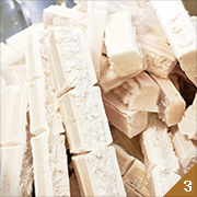 製造工程はまず、冷凍の塊で入荷したスケソウダラのすり身を粗くカットし、かにエキス、みりんなどの液体調味料を加えて撹拌。これを厚さ1.6ミリの帯状に延ばして、蒸気で蒸します。その後、麺切りという機械を使って細い繊維状にカット。麺切りの工程は、残念ながら企業秘密ということで撮影はできませんでしたが、まさにうどんやそばなどの麺を切るイメージです。