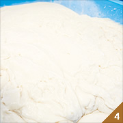 なめらかに撹拌したすり身。これを薄いシート状に伸ばし、麺切りの機械で細くカットしていきます。