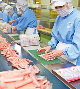 「かにかまのなめらかな食感と風味のよさは、新鮮なすり身だからこそ出せる味わい。すり身の配合量も多いので、しっかりした弾力も生きています」
